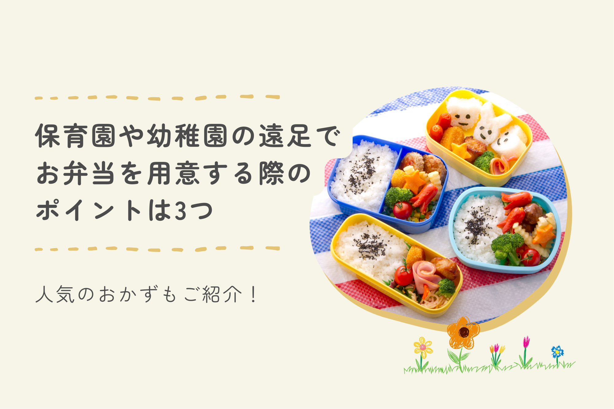 遠足では普段と違う環境で食事をするため、いつも以上に配慮が必要です。食べやすさ、衛生面、そしてお弁当箱への詰め方を意識することで、子どもが楽しく安全に食事ができます。